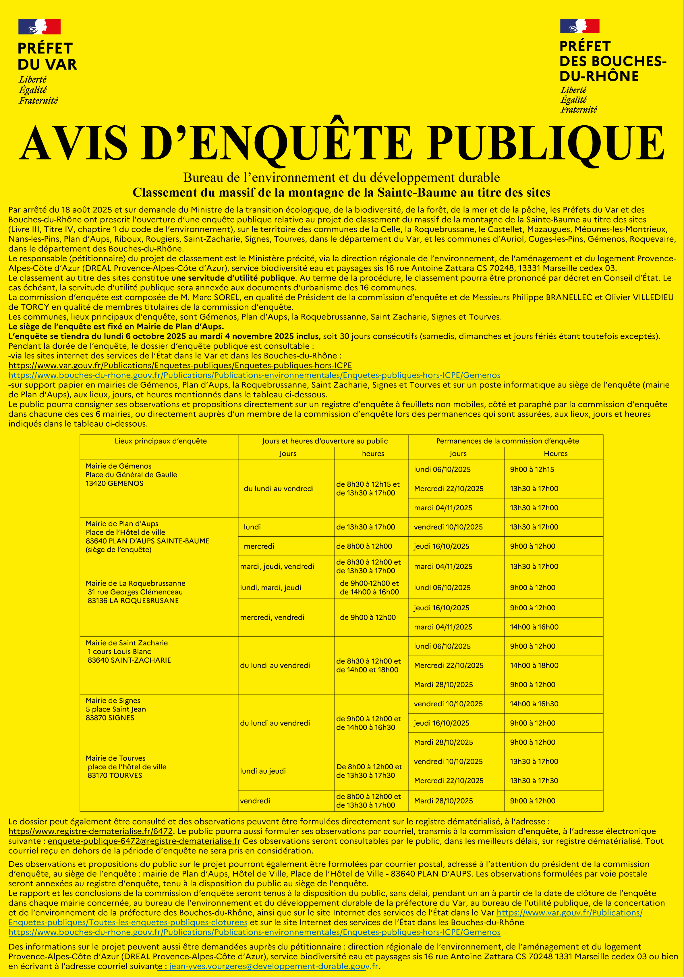 👉 L'enquête se déroulera du lundi 6 octobre au mardi 4 novembre inclus, notamment dans les mairies de Gémenos, Plan d'Aups (siège de l'enquête), La Roquebrussanne, Saint Zacharie, Signes et Tourves.