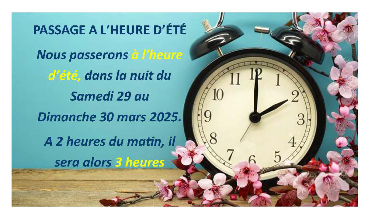 CHANGEMENT D'HEURE CE WEEK-END 28/03/2025 Nous vous rappelons que nous passons à l'heure d'été ☀️dans la nuit du SAMEDI 29 au DIMANCHE 30 MARS 2025. A 2 heures du matin, il sera alors 3 heures 🙂