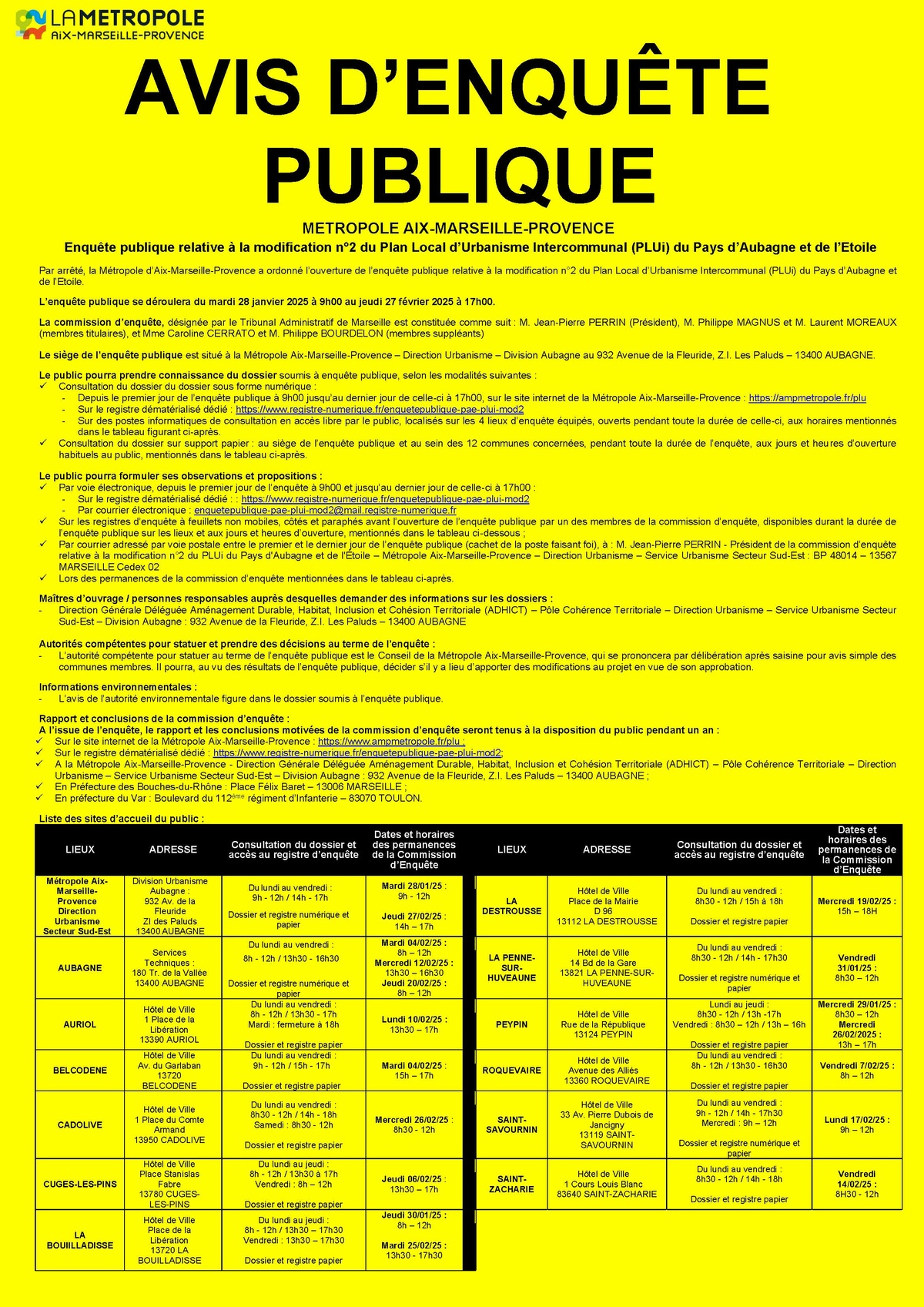 La Métropole Aix-Marseille Provence organise une enquête publique portant sur le projet de modification n°2 du Plan Local d’Urbanisme intercommunal (PLUi) du Pays d’Aubagne et de l’Étoile.