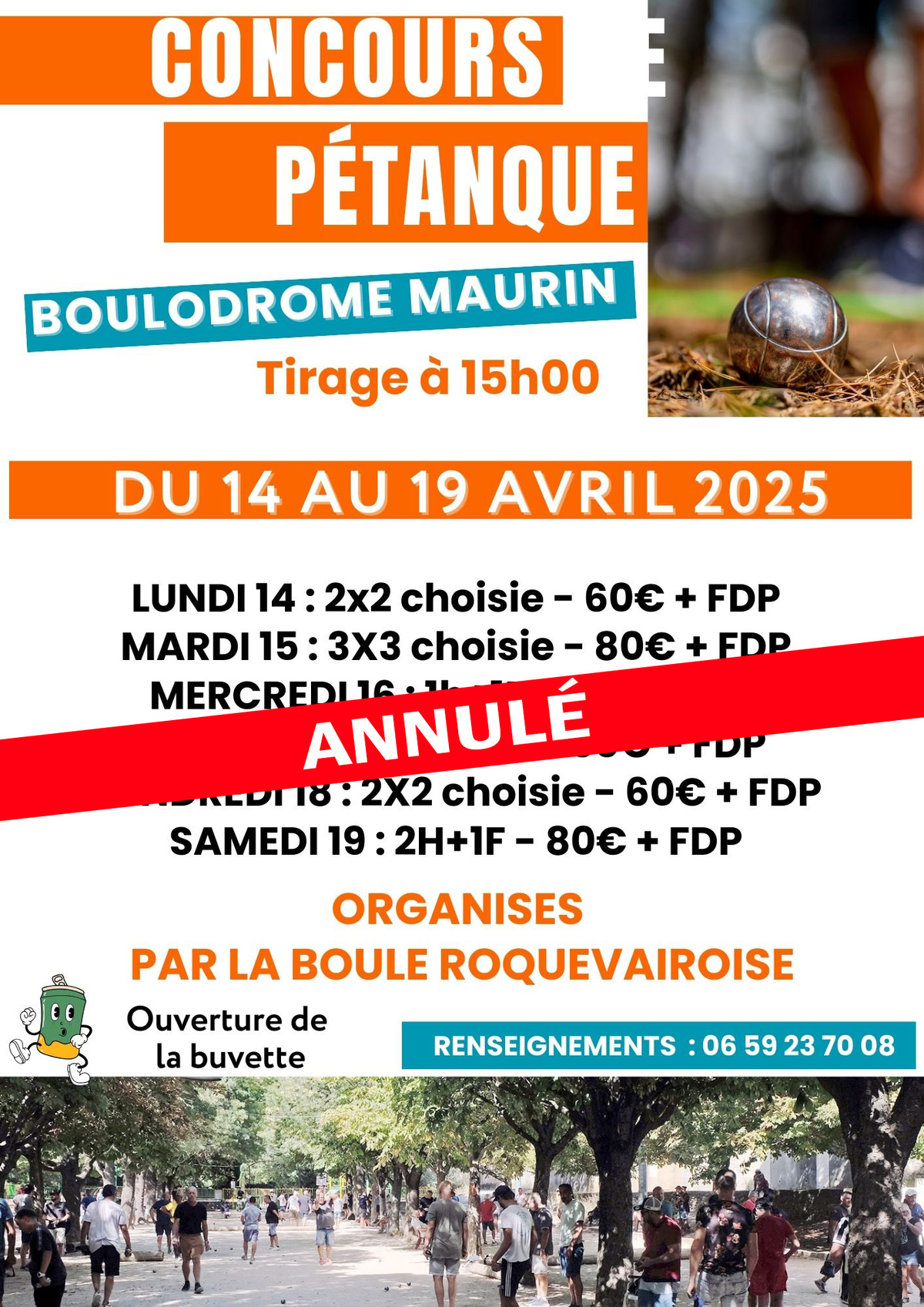 Nous vous informons que la semaine bouliste, prévue du 14 au 19 avril par La Boule Roquevairoise, est annulée.