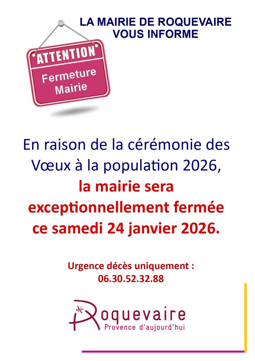 En raison de la cérémonie des vœux à la population, la mairie sera exceptionnellement fermée, demain, samedi 24 janvier.