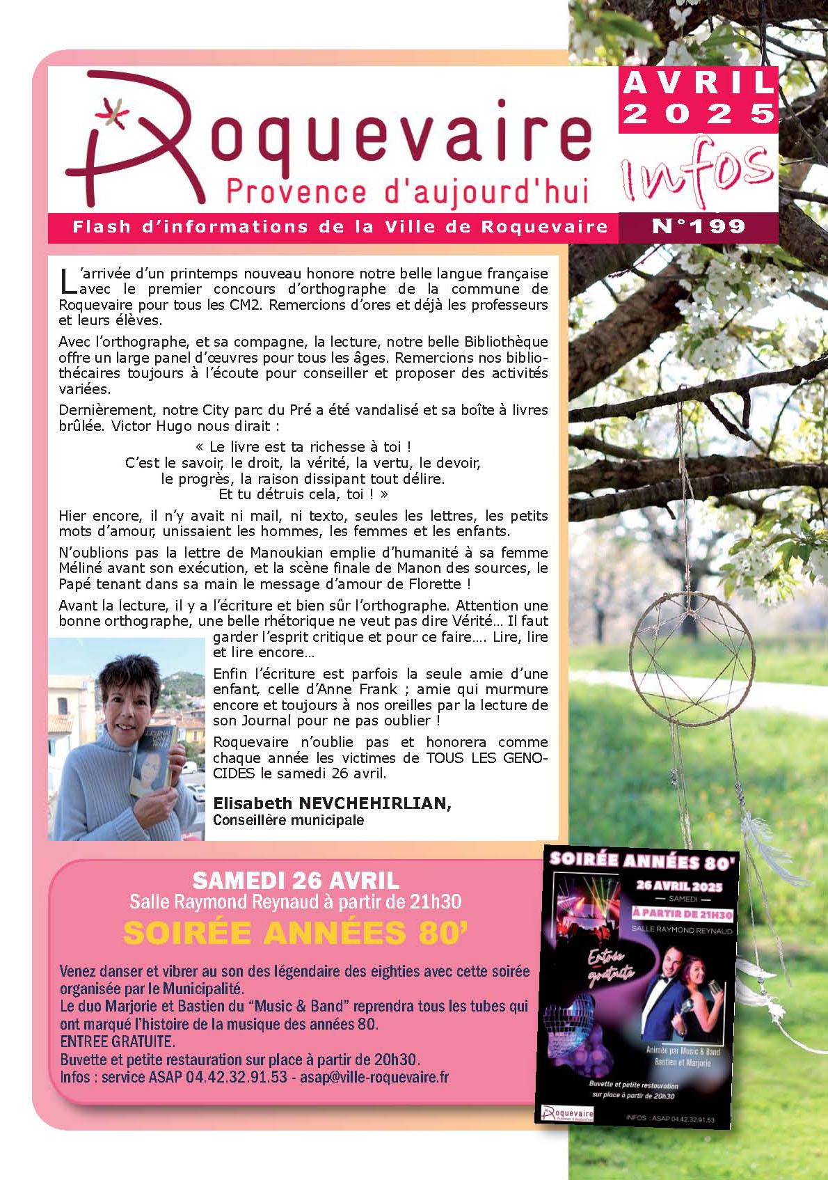 LE MENSUEL D’AVRIL EST PARU 31/03/2025 En cours de distribution sur la commune, il est également téléchargeable sur le site de la ville :https://ville-de-roquevaire.fr/revue-municipale/