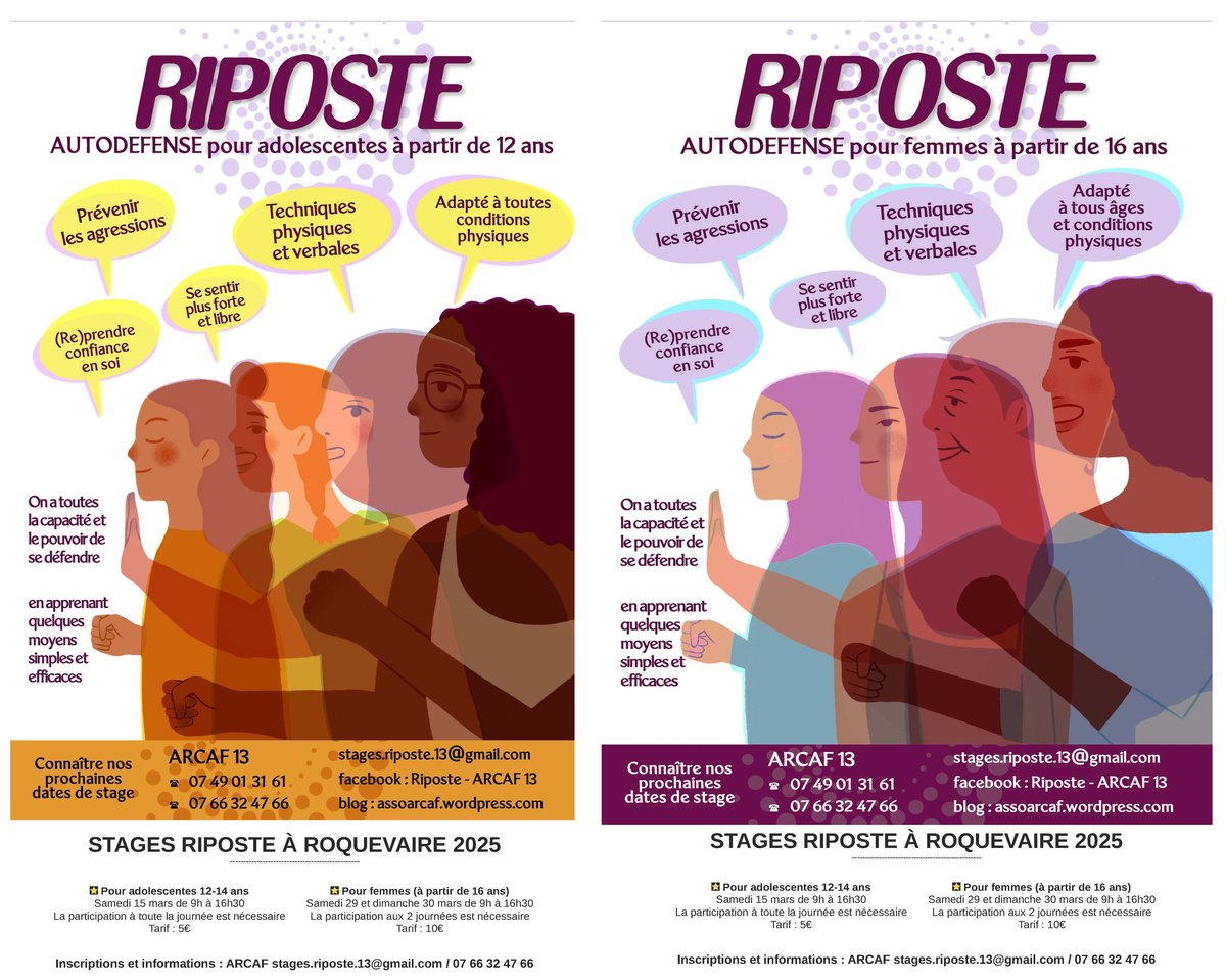 👉Inscriptions et Informations : ARCAF stages.riposte.13@gmail.com – 07 66 32 47 66