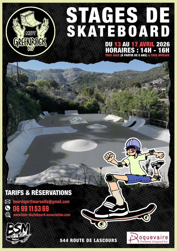 ⏩ Skateboard du 13 au 17 avril, de 14h à 16h, sur le Skate Park (route de Lascours), à partir de 5 ans, tous niveaux : 120 € la semaine, matériel fourni (planche, casque, protections). Infos, inscription : 06.99.11.53.69 - boardspiritmarseille@gmail.com.
