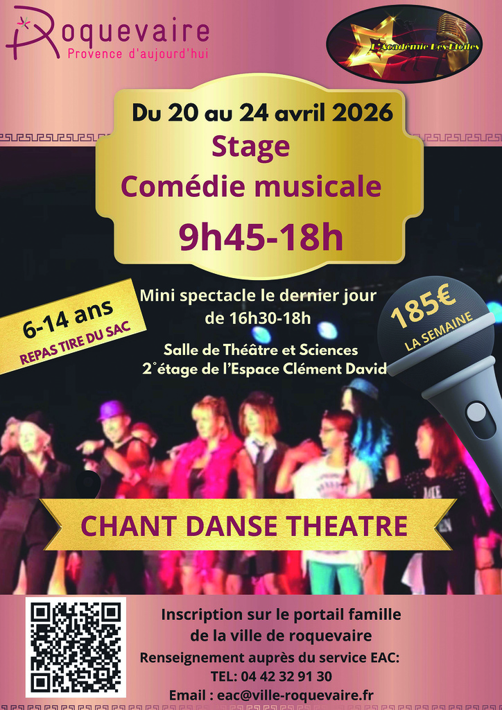 ⏩ Comédie Musicale du 20 au 24 avril, salle de théâtre+ salle de science et salle de gym de l'Espace Clément David : forfait semaine 185 €.