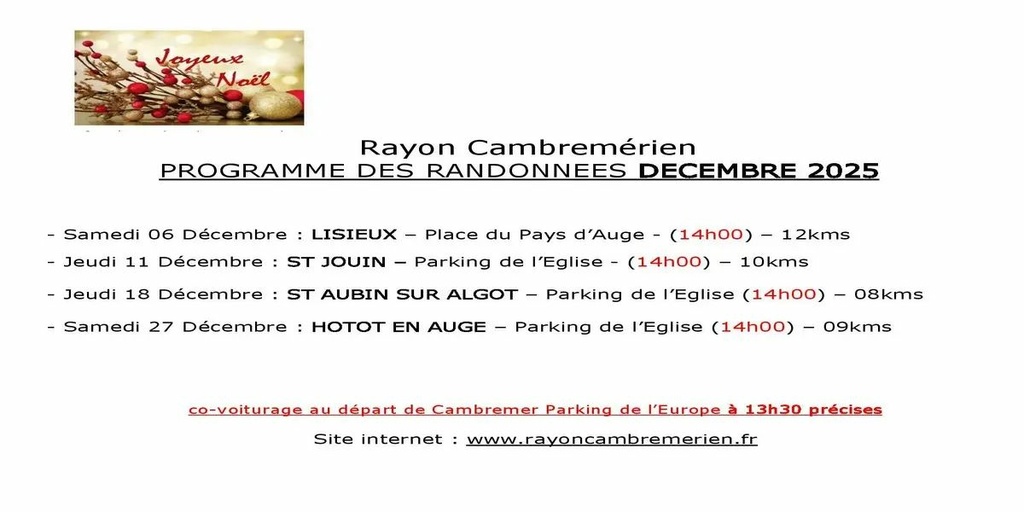 Programme Des Randonnées De Décembre Du Rayon Cambremerien 09/12/2025 RANDONNÉES DE DÉCEMBRE Un peu d'exercice pour préparer les fêtes, y'a pas mieux ! Retrouvez le programme des sorties du Rayon Cambremérien en cliquant ici