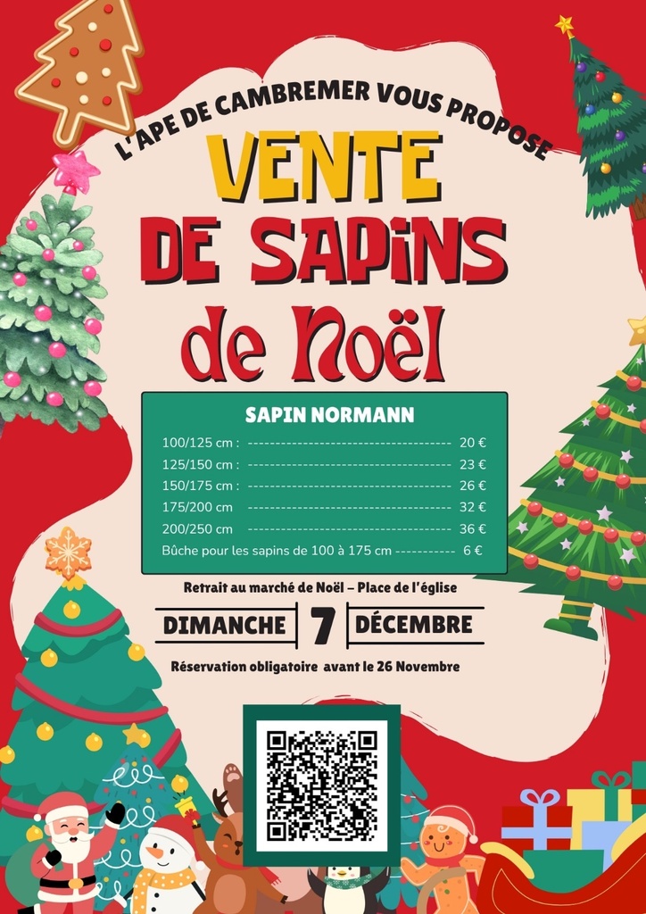 Vente De Sapins De Noël Au Profit De L'ape 13/11/2025 L'APE de Cambremer vous propose cette année une vente de sapins de Noël. Les bénéfices de ces ventes permettront de financer les projets de l'école. La réservation se fait avant le 26 novembre via cette adresse: https://www.helloasso.com/associations/ape-ecole-publique-cambremer/boutiques/vente-de-sapin Les sapins seront distribués lors du marché de Noël, le dimanche 7 décembre. N'attendez plus !