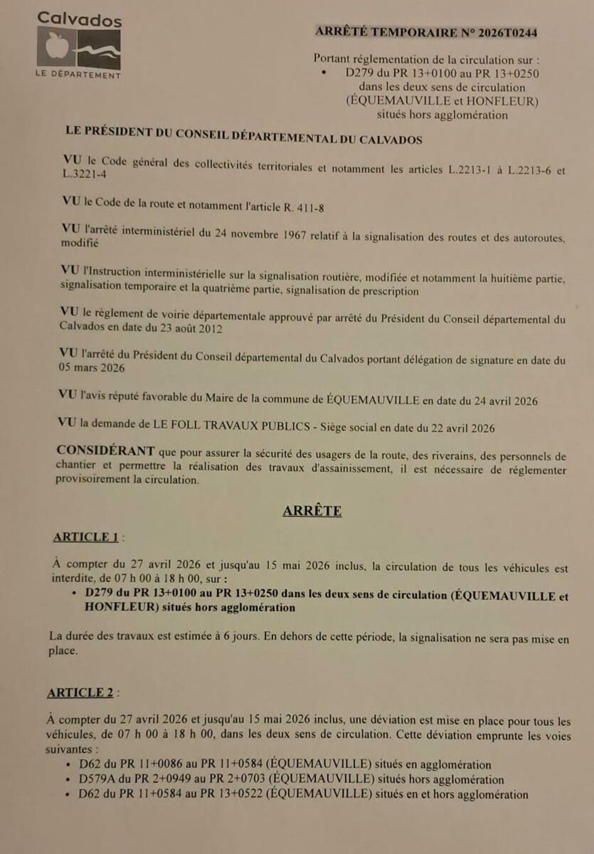 Arrêté préfectoral : d279 27/04/2026 Interdiction de circulation par arrêté préfectoral du 27 avril au 15 mai 2026 sur la D279