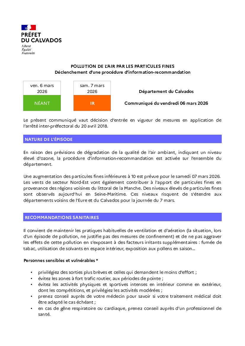 Le préfet du Calvados, au vu des informations transmises par le réseau de surveillance Atmo Normandie, met en œuvre la procédure d'information et de recommandation pour une pollution de l'air par les particules fines sur le département du Calvados.