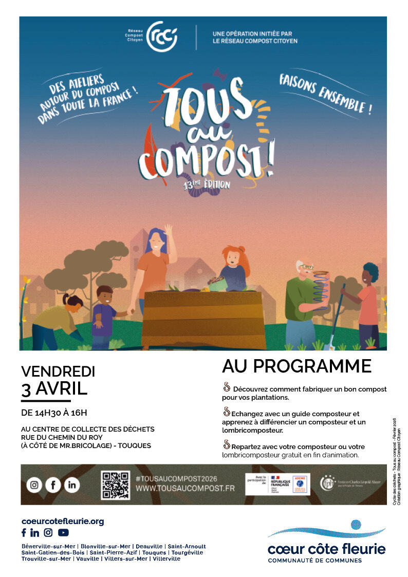 Dans le cadre de la quinzaine nationale TOUS AU COMPOST qui a lieu du 28 mars au 12 avril 2026, la Communauté de Communes Coeur Côte Fleurie organise une animation dédiée au compostage : le vendredi 3 avril 2026 de 14h30 à 16h00 au Centre de collecte de Touques (chemin du Roy entre Aldi et Mr Bricolage).