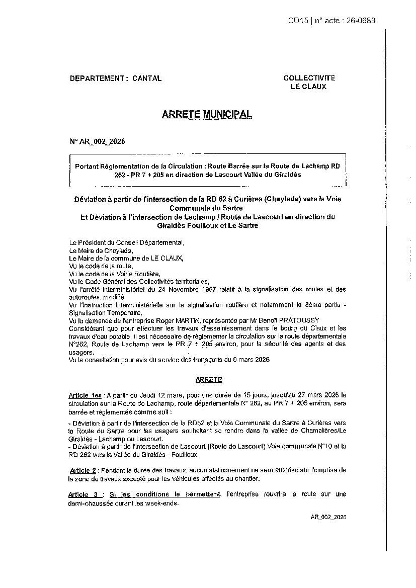 Réglementation de la Circulation : Route Barrée Lachamp