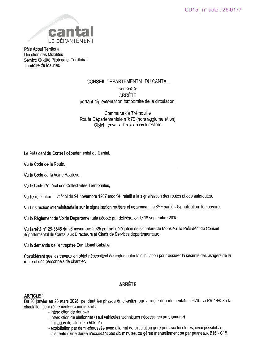 en raison de travaux d'exploitation forestière, la circulation est réglementée et contrainte du 26 janvier 2026 au 26 mars 2026 sur la RD 679