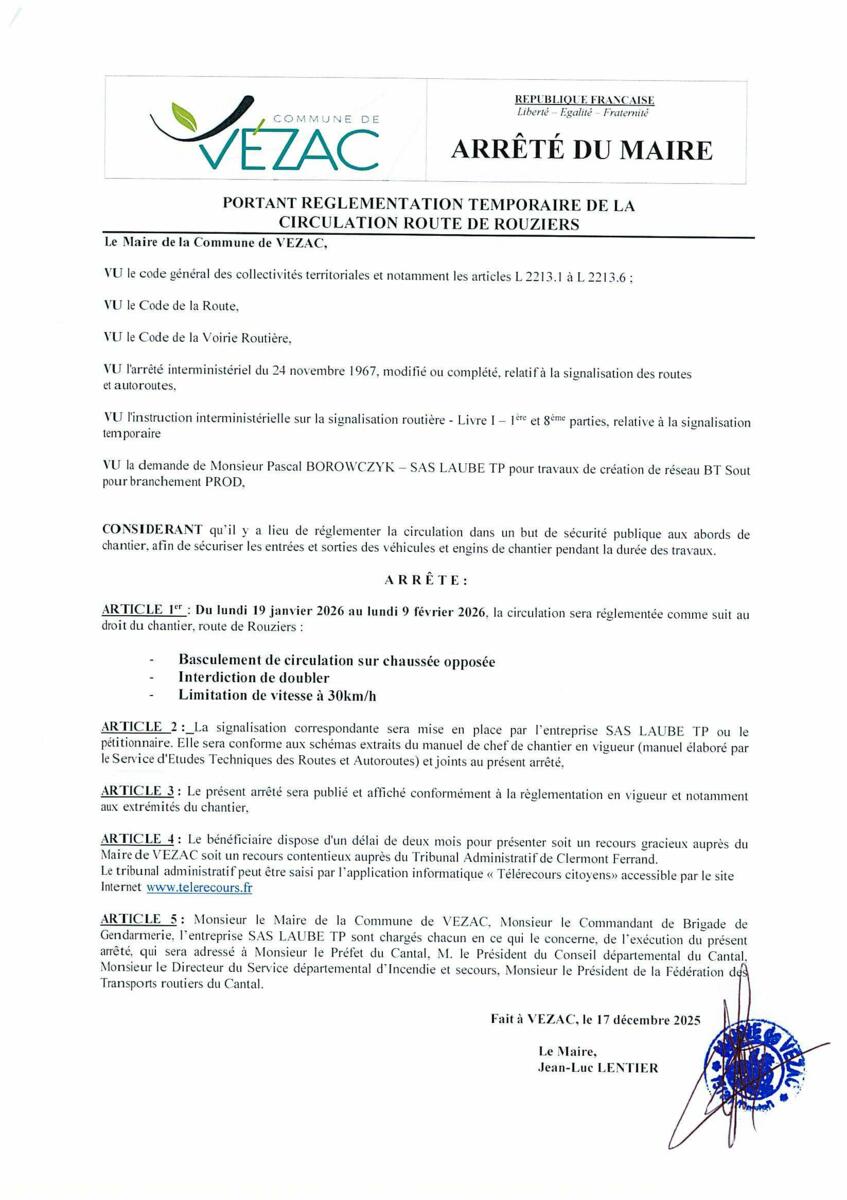 ARRETE portant sur la réglementation de la circulation 22/12/2025 Travaux route de Rouziers du 19 Janvier au 09 février 2026.