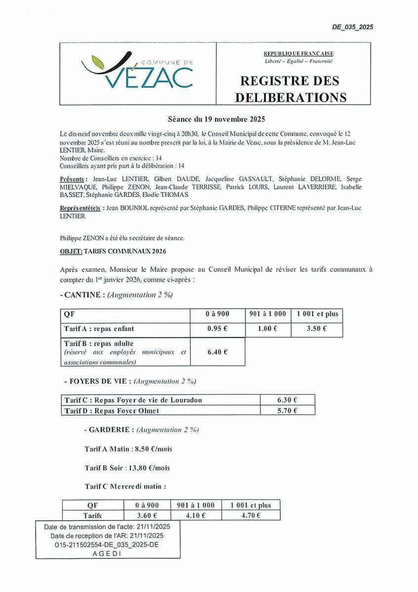 DELIBERATION DES TARIFS 2026 30/12/2025 Les tarifs des services périscolaires, location salle polyvalente, etc... 🤑