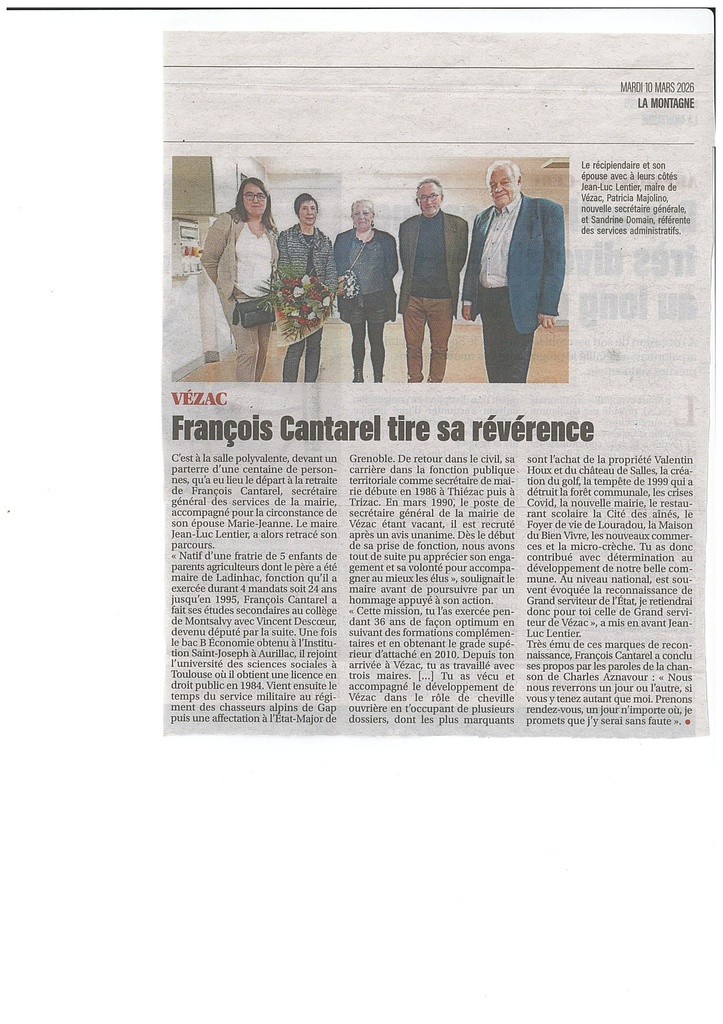 DEPART A LA RETRAITE DE M. CANTAREL FRANCOIS. 16/03/2026 Article du journal "La Montagne" du Mardi 10 Mars 2026. Journaliste : M. ROCHE Gilbert.