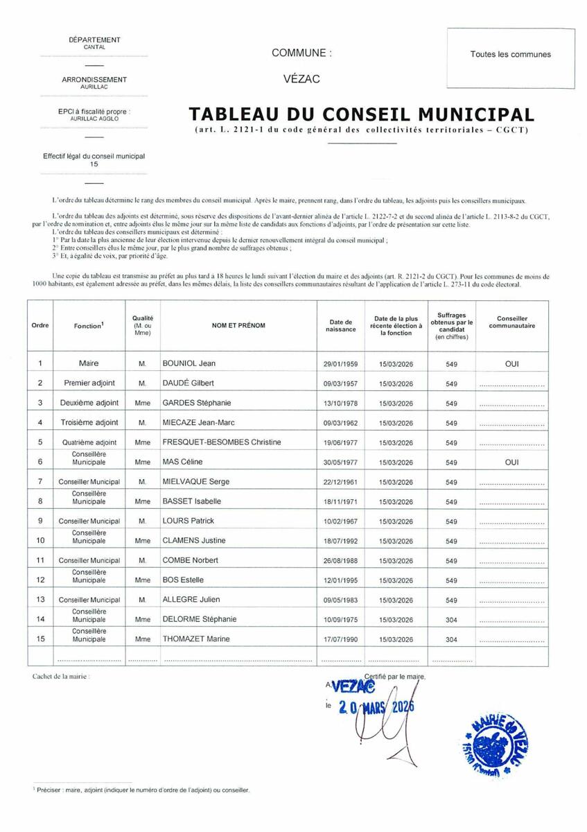 TABLEAU DU CONSEIL MUNICIPAL AU 20.03.2026 24/03/2026 Nouveau conseil municipal suite aux élections municipales du 15.03.2026. 🙂
