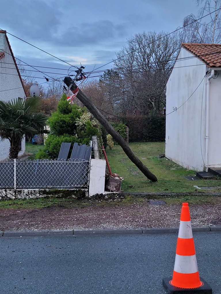 SUITE À UN ACCIDENT RUE DE LA MAIRIE AU NIVEAU DU N°8, UN POTEAU TÉLÉPHONIQUE A ÉTÉ TRÈS ENDOMMAGÉ.