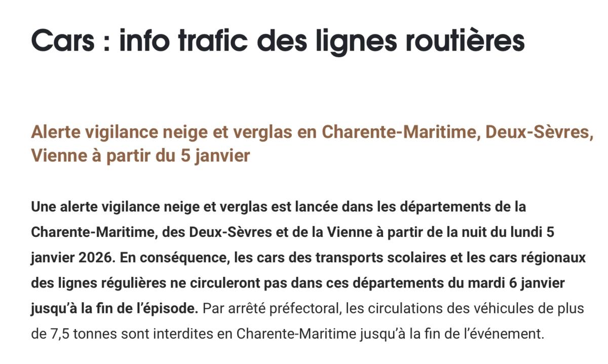 Comme cela était prévisible, le site de la Région Nouvelle-Aquitaine annonce qu'il n'y aura pas de transports scolaires demain mardi 6 janvier 2026.