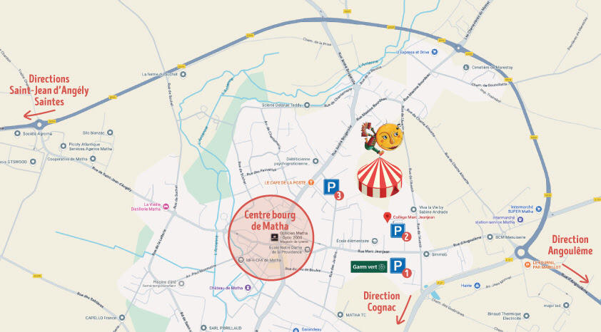 Le chapiteau se trouve juste derrière le collège de Matha (surveillez les fléchages aux entrés de Matha). Pour les parkings :