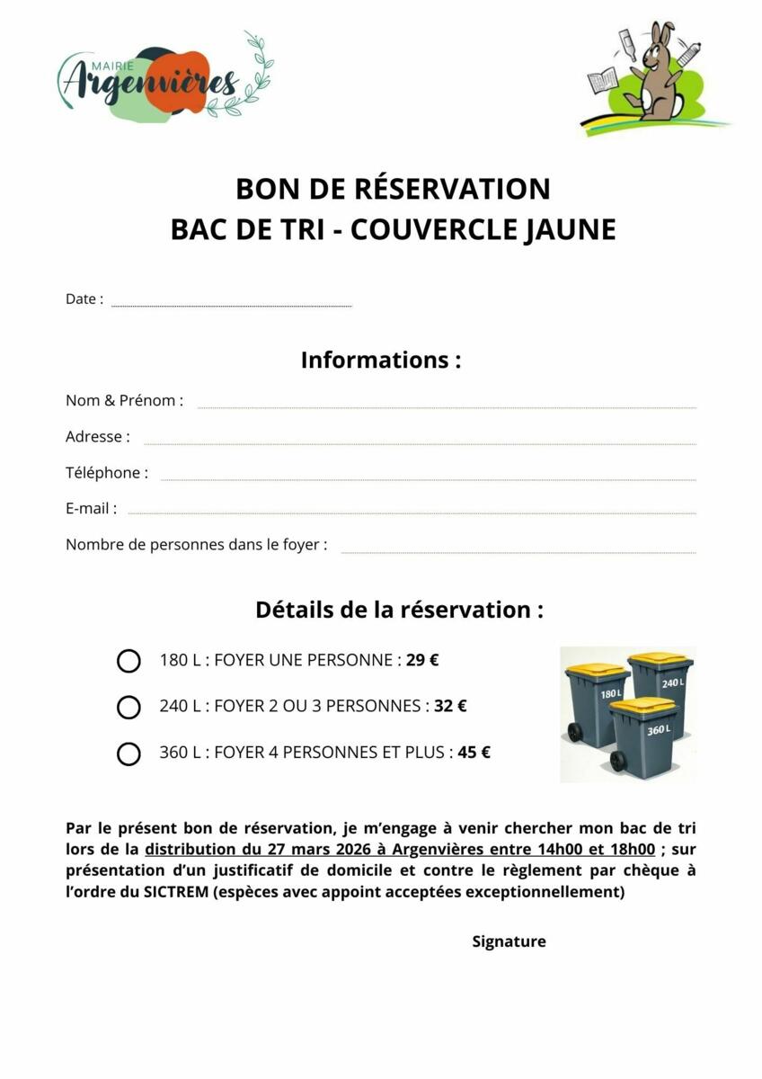 - Réservez votre conteneur à la mairie d'Argenvières via le coupon ci-joint (disponible en mairie) avant le vendredi 20 mars 2026.