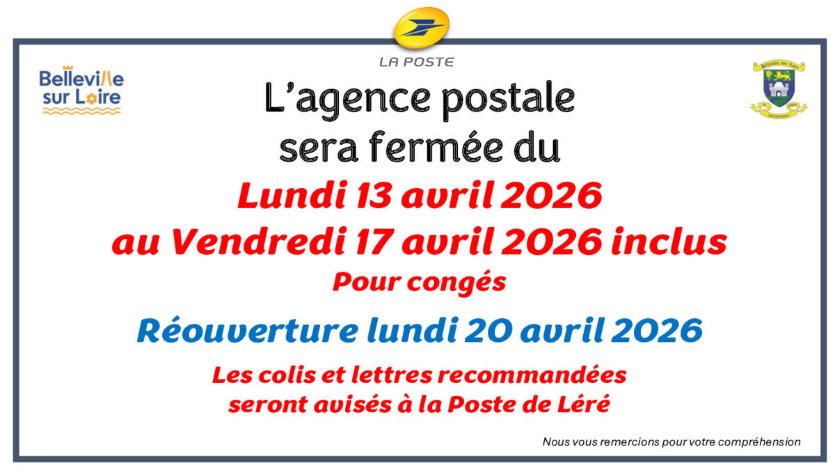 Agence postale fermée du 13 au 17 avril 2026 pour congés 13/04/2026 Source : Mairie de Belleville-sur-Loire