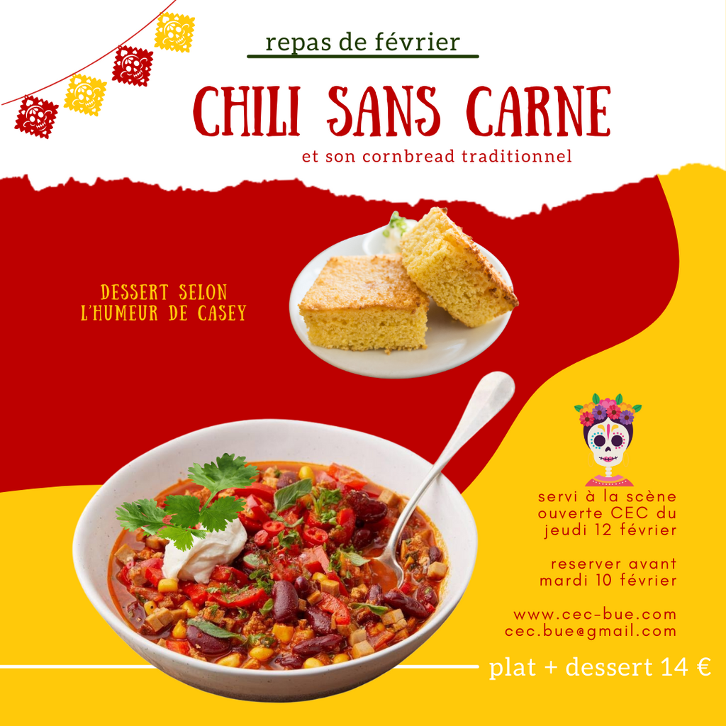 Repas maison : Chili sans Carne et son cornbread traditionnel, et dessert maison selon l'humeur de Casey. 14€, réserver à l'avance, par e-mail ou sur le site. Servi à partir de 20h.