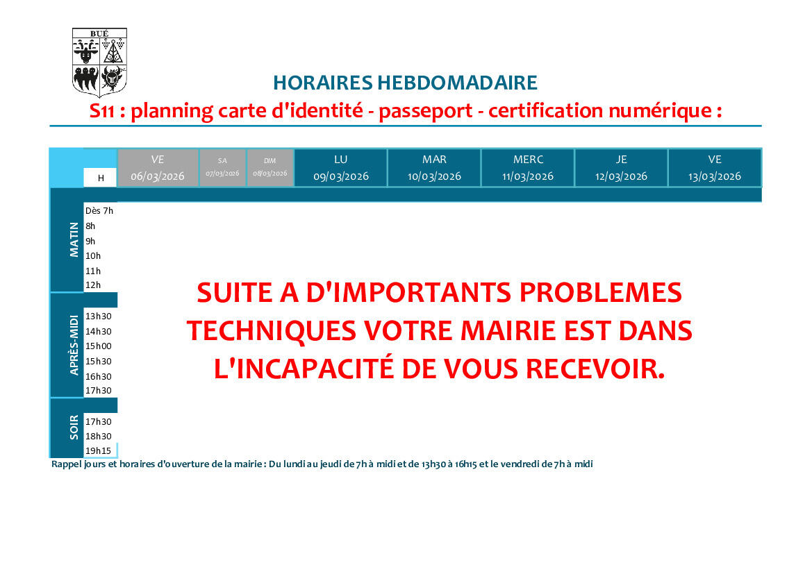 Planning d'ouverture S11 06/03/2026 Jours et horaires d'ouverture du bureau des titres d'identité et certification numérique : Source : Mairie de Bué