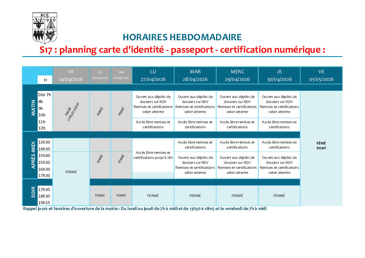 Votre mairie / Actualités / Planning d'ouverture S16 ET 17