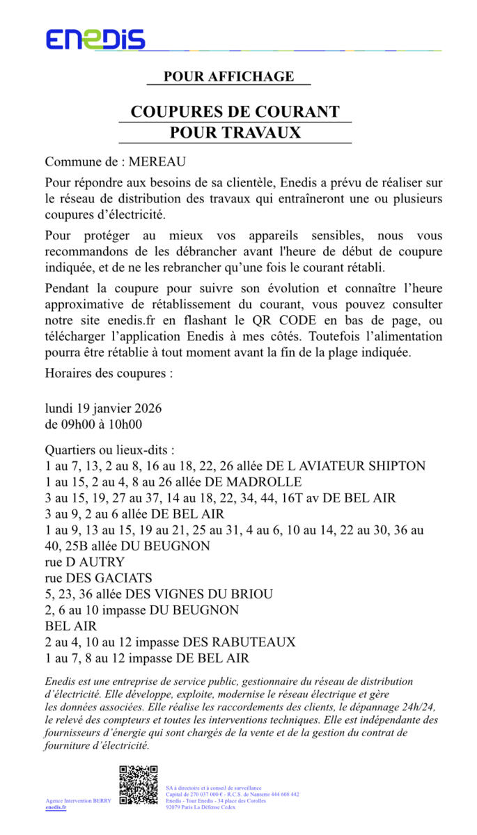 Rappel d'une coupure d'électricité programmée le 19/01/2026