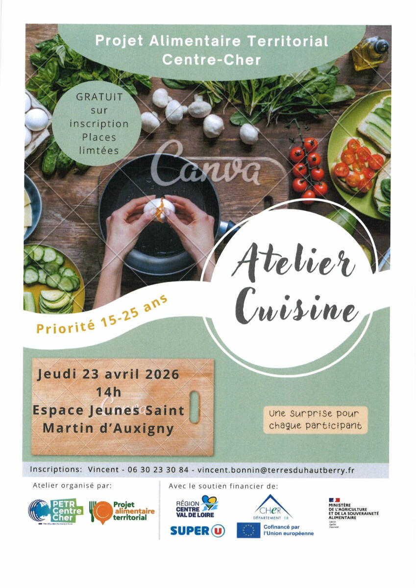 Atelier cuisine le 23 avril 2026 à St Martin d'Auxigny 14/04/2026 . Source : Mairie de Moulins-sur-Yèvre