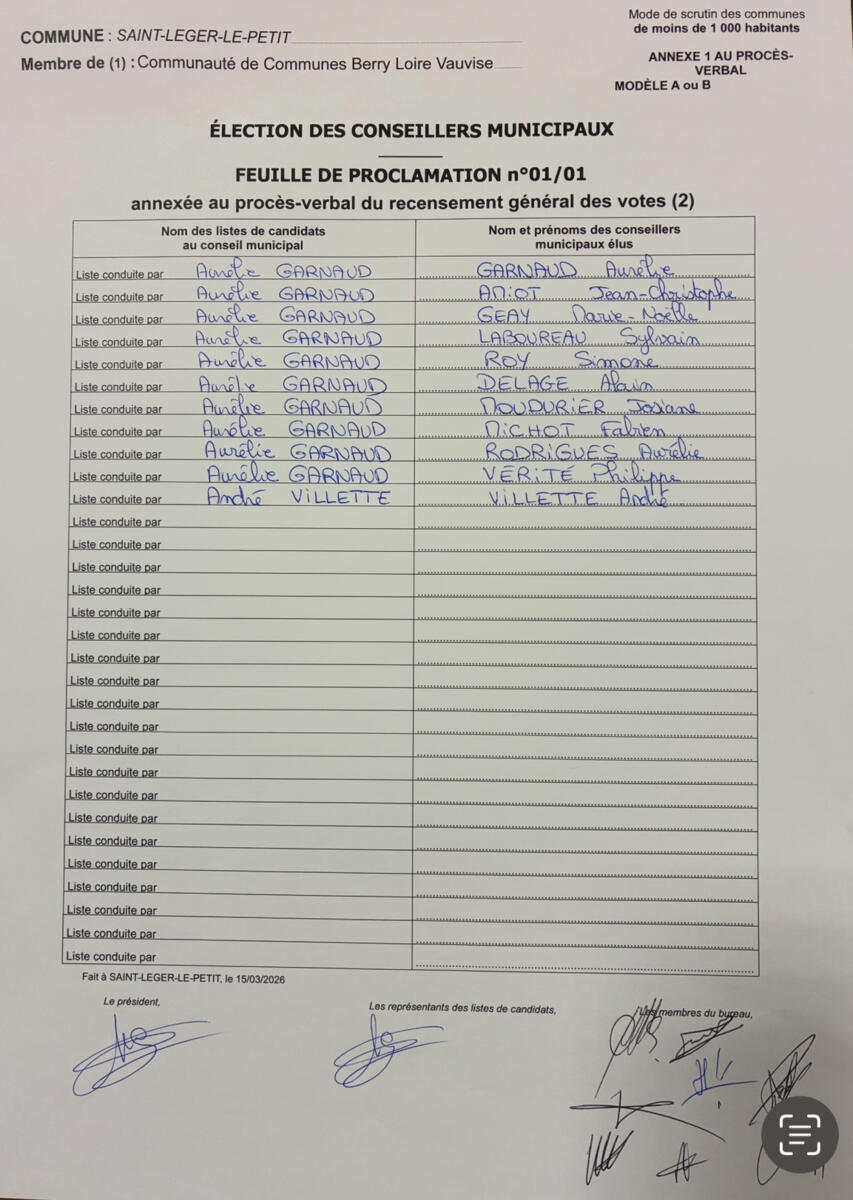10 sièges pour le liste « Agir ensemble à Saint-Léger-le-Petit » avec 175 voix (74,15%)