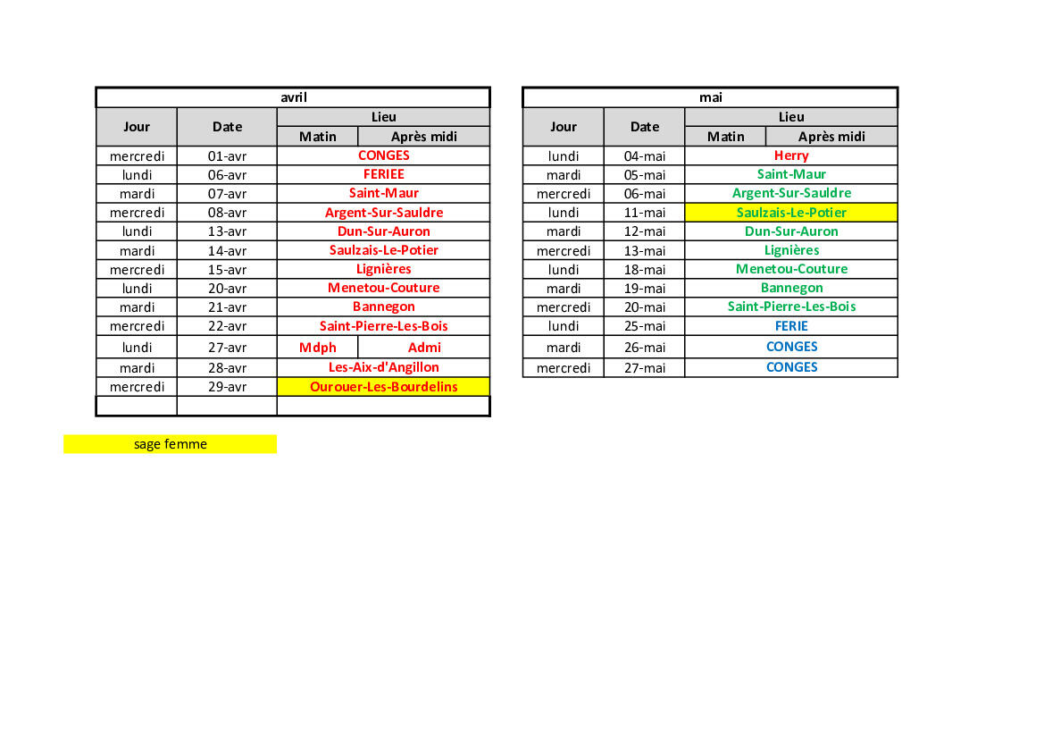 La sage-femme sera présente en avril à Ourouer les Bourdelins et en mai à Saulzais le Potier.