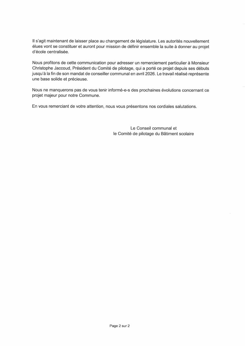 Veuillez trouver, ci-dessous, la communication officielle expliquant la situation actuelle du projet d’école centralisée.