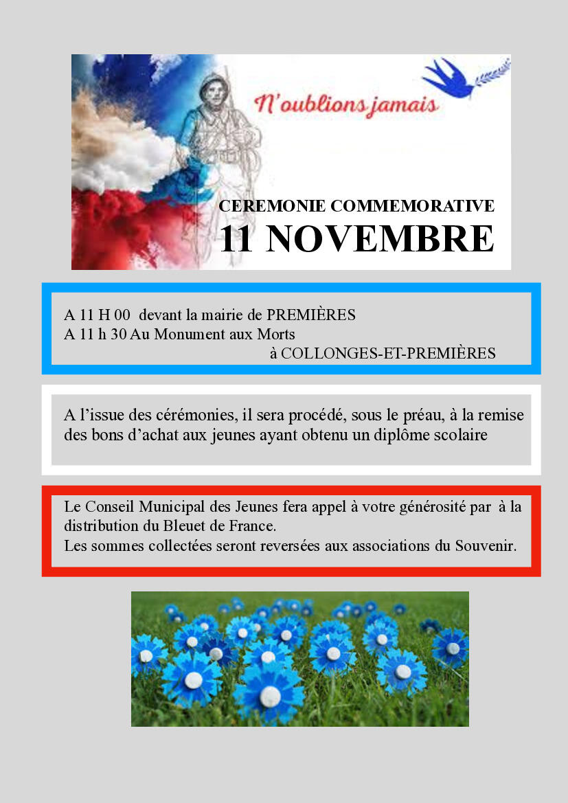 M. le Maire et le Conseil municipal, le Conseil municipal des Jeunes vous invitent aux cérémonies de commémoration de l'Armistice de 1918.