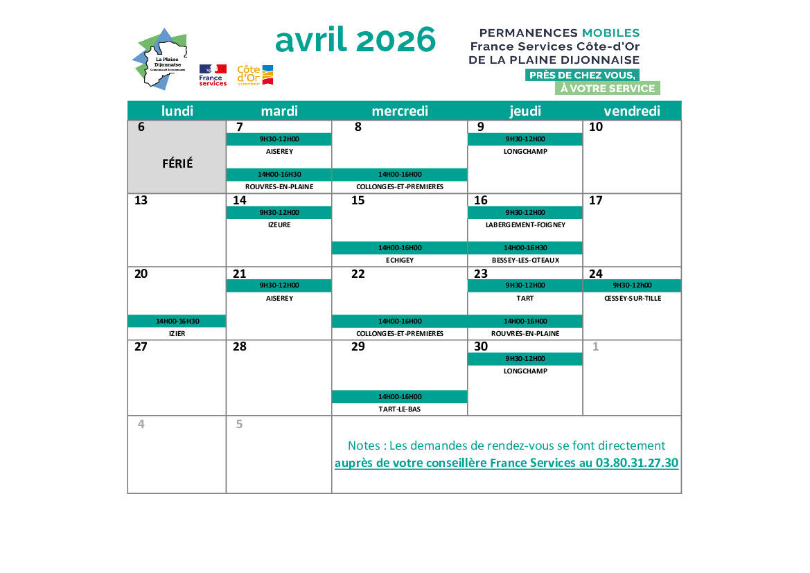 Vous trouverez ci-joint le planning des permanenciers de la France services Côte d’Or de la Plaine Dijonnaise pour le mois d’avril 2026.