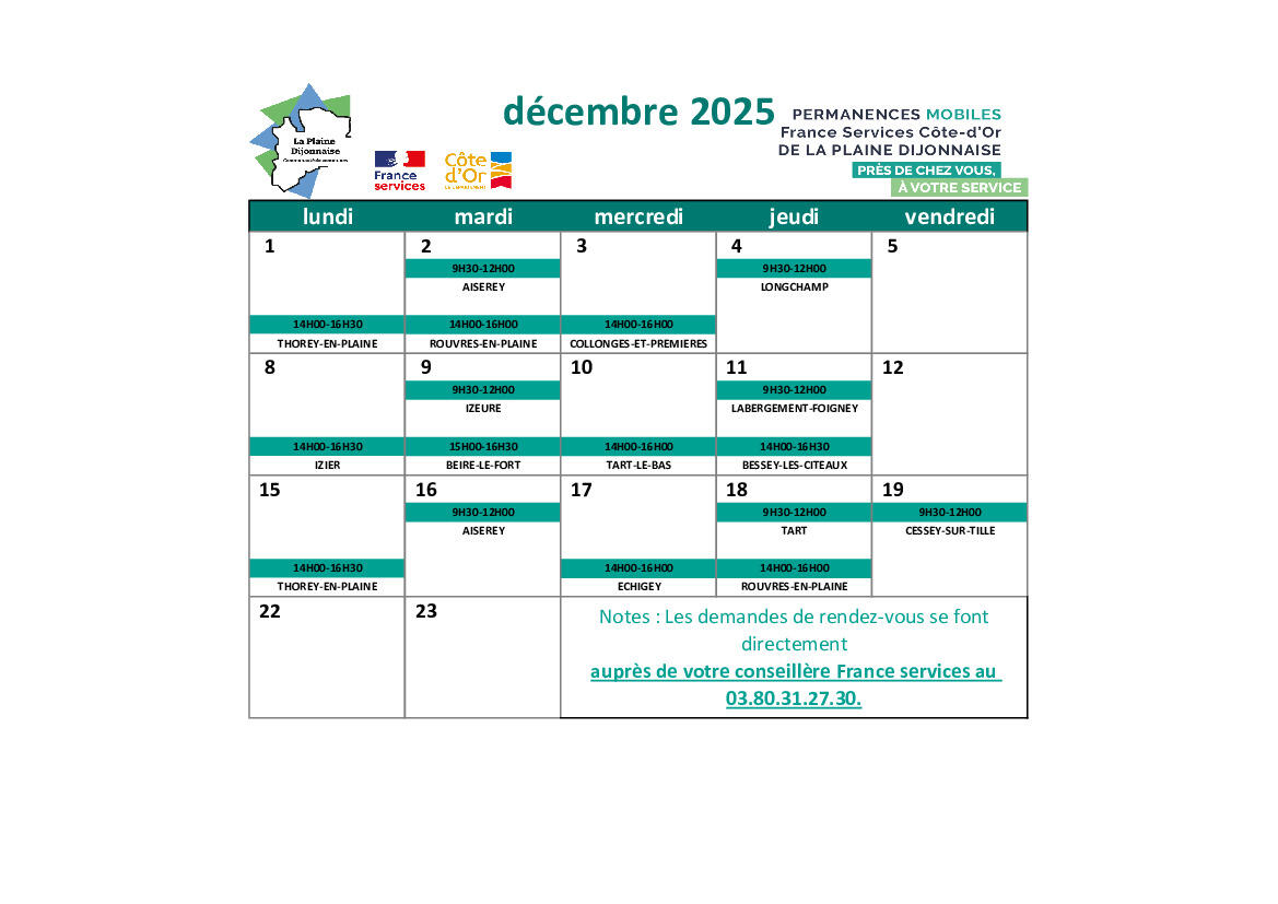 Vous trouverez ci-joint le planning des permanenciers de la France services Côte d’Or de la Plaine Dijonnaise pour le mois de décembre 2025.