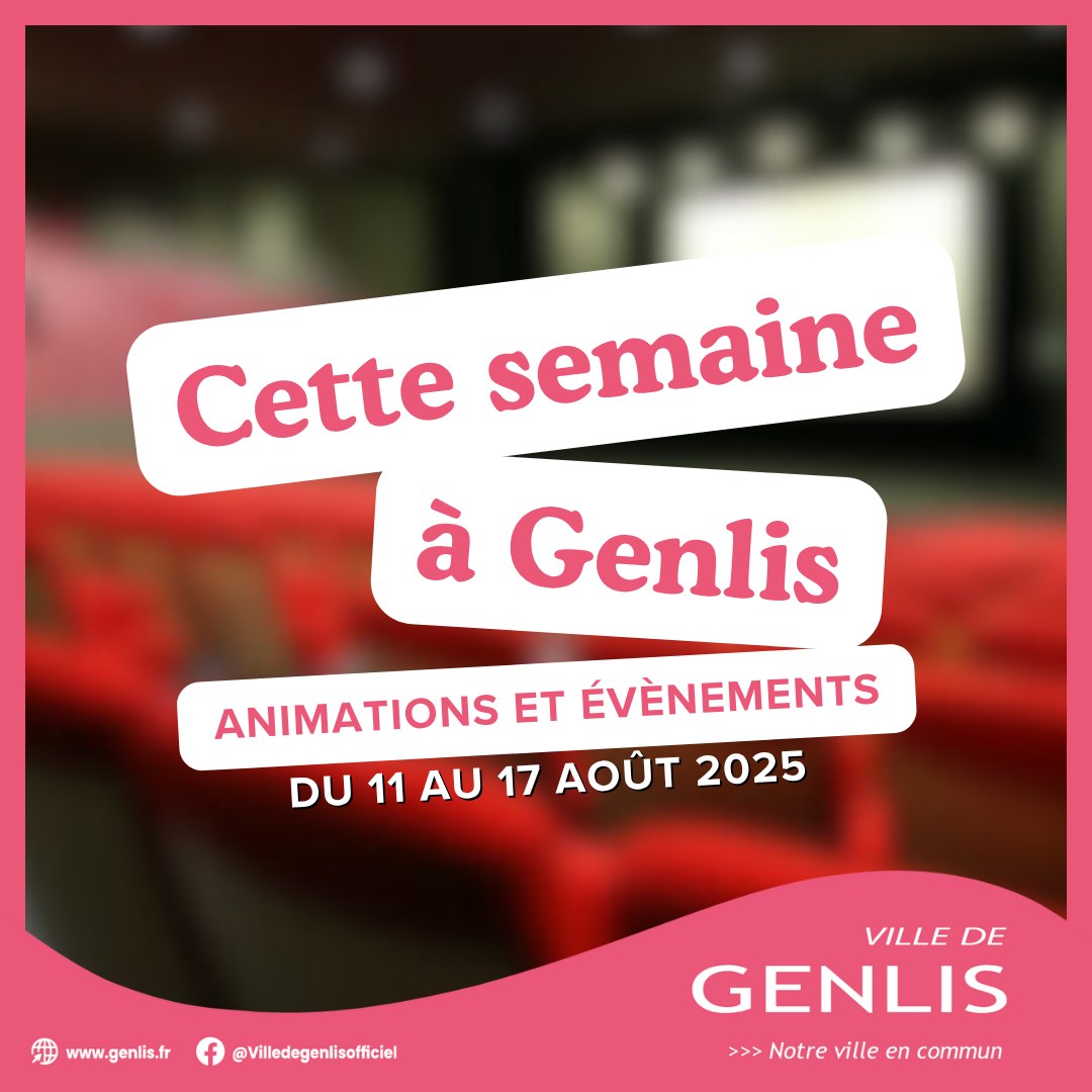 Cette Semaine À Genlis : Du 11 Au 17 Août 🌟 11/08/2025 Dernière semaine pour profiter du cinéma avant la fermeture annuelle du 18 août au 16 septembre ! 👉 Tout le programme du cinéma :https://www.genlis.fr/mes-activites/cinema/ 👉 Le détail des événements municipaux et associatifs :https://www.genlis.fr/evenements/