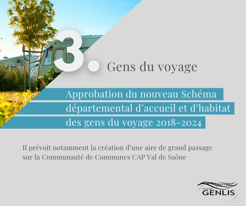 ✅ Gens du voyage : approbation du nouveau Schéma départemental d’accueil et d’habitat des gens du voyage 2018-2024 prévoyant notamment la création d’une aire de grand passage sur la Communauté de Communes CAP Val de Saône