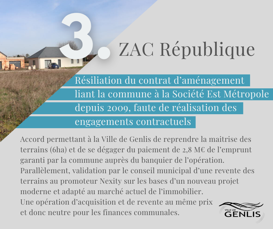 ✅ Quartier République : résiliation du contrat d’aménagement liant la commune à la Société Est Métropole depuis 2009, faute de réalisation des engagements contractuels. Accord permettant à la Ville de Genlis de reprendre la maitrise des terrains (6ha) et de se dégager du paiement de 2,8 M€ de l’emprunt garanti par la commune auprès du banquier de l’opération