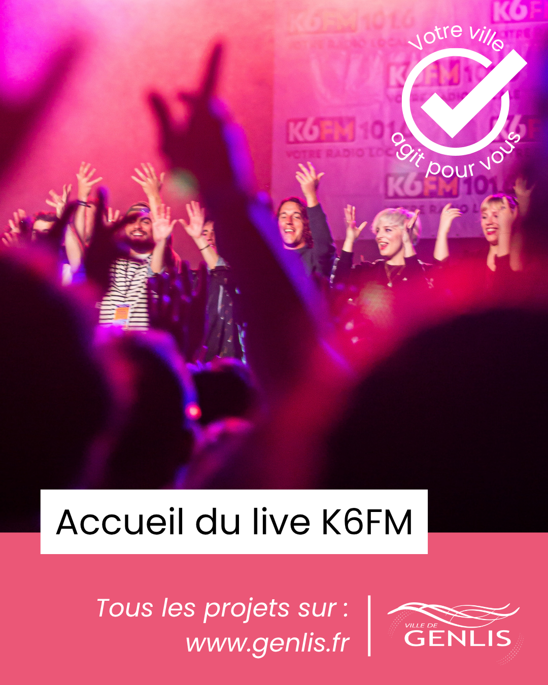 Votre Ville Agit Pour Vous ! ✅ 26/07/2025 Après une première édition en 2023, le live K6FM revient à Genlis le 17 octobre prochain : une soirée de musique 100 % gratuite et festive !- Programmation à venir - 👉 Retrouvez l'ensemble des initiatives municipales en cours ou terminées sur notre site :https://www.genlis.fr/custom-page/projets-de-ville-et-realisations/