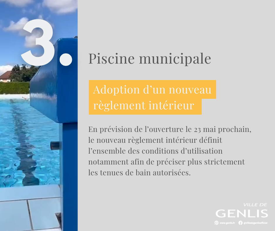 ✅ Piscine municipale : en prévision de l’ouverture le 23 mai prochain, adoption d’un nouveau règlement intérieur définissant l’ensemble des conditions d’utilisation notamment afin de préciser plus strictement les tenues de bain autorisées