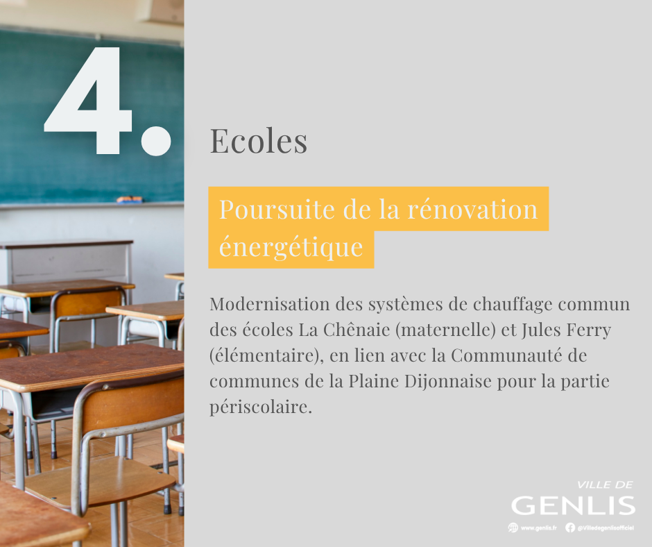 ✅ Ecoles : poursuite de la rénovation énergétique des écoles La Chênaie (maternelle) et Jules Ferry (élémentaire), par la modernisation de leur système de chauffage commun, en lien avec la Communauté de communes de la Plaine Dijonnaise pour la partie périscolaire