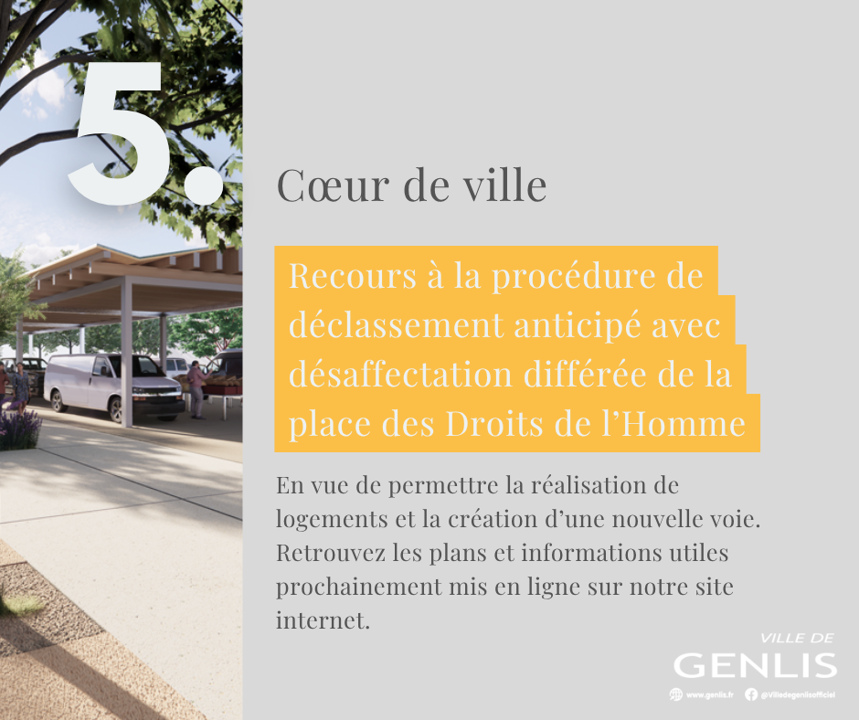 ✅ Cœur de ville : Recours à la procédure de déclassement anticipé avec désaffectation différée de la place des Droits de l’Homme, en vue de permettre la réalisation de logements et la création d’une nouvelle voie (plans et informations utiles prochainement sur notre site internet)