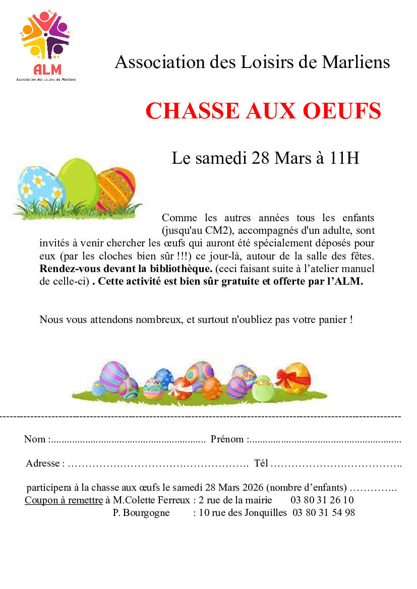 Comme les autres années tous les enfants (jusqu'au CM2), accompagnés d'un adulte, sont invités à venir chercher les œufs qui auront été spécialement déposés pour eux (par les cloches bien sûr !!!) ce jour-là, autour de la salle des fêtes. Rendez-vous devant la bibliothèque. (ceci faisant suite à l’atelier manuel de celle-ci) . Cette activité est bien sûr gratuite et offerte par l’ALM.