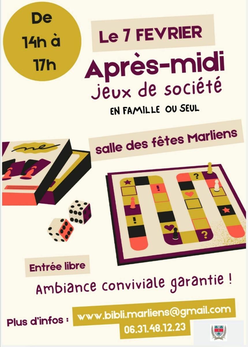 Aujourd'hui Après Midi Jeux De Société Ouvert À Tous 07/02/2026 La bibliothèque de Marliens organise un après midi jeux de société ouvert à tous. Nous vous attendons nombreux.