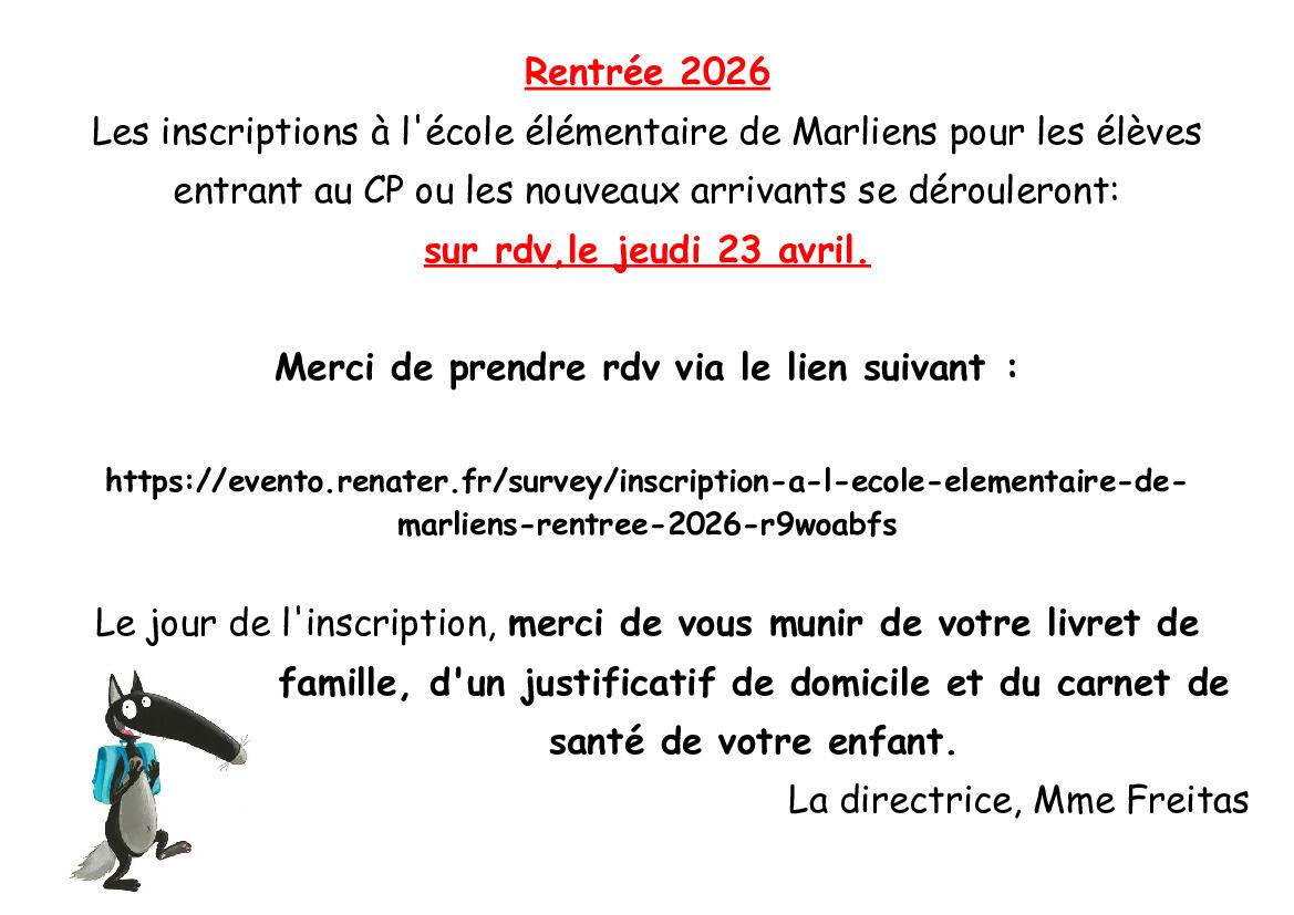 Inscriptions À L'école Élémentaire Pour La Rentrée 2026. 19/03/2026 Le lien pour prendre rendez-vous est le suivant: https://evento.renater.fr/survey/inscription-a-l-ecole-elementaire-de-marliens-rentree-2026-r9woabfs