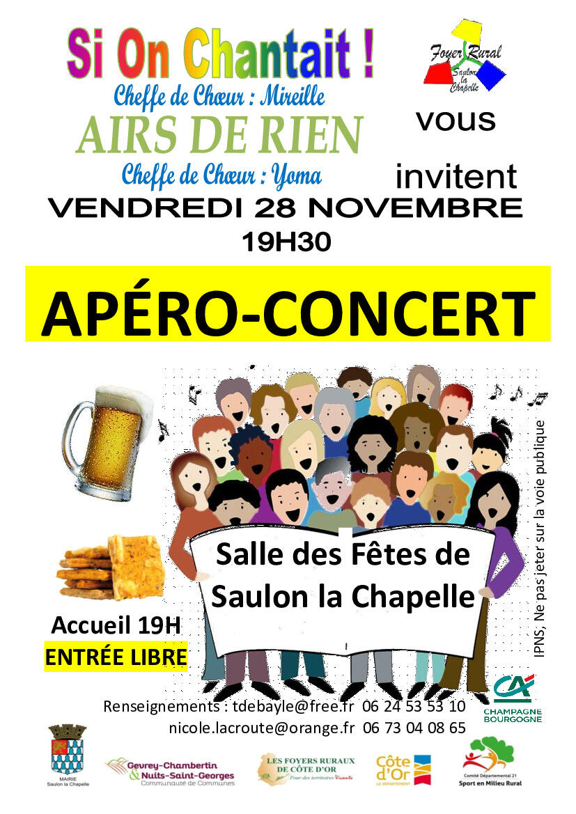 Apéro Concert 26/11/2025 La Section du Foyer Rural "Si on chantait" organise un apéro-concert à la salle des fêtes Accueil à 19h. Entrée libre. Buvette sur place