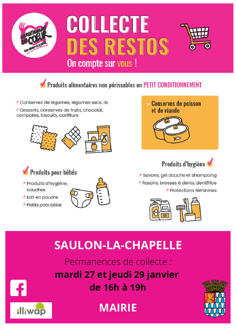 Collecte Des Restos Du Coeur 23/01/2026 Mardi 27 et jeudi 29 janvier de 16h à 19h Mairie Toutes les infos en cliquant sur le document Les Restos comptent sur vous !