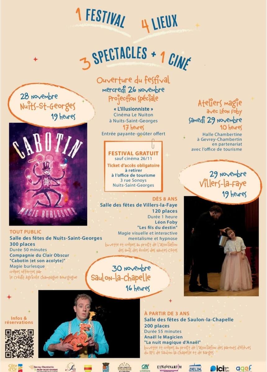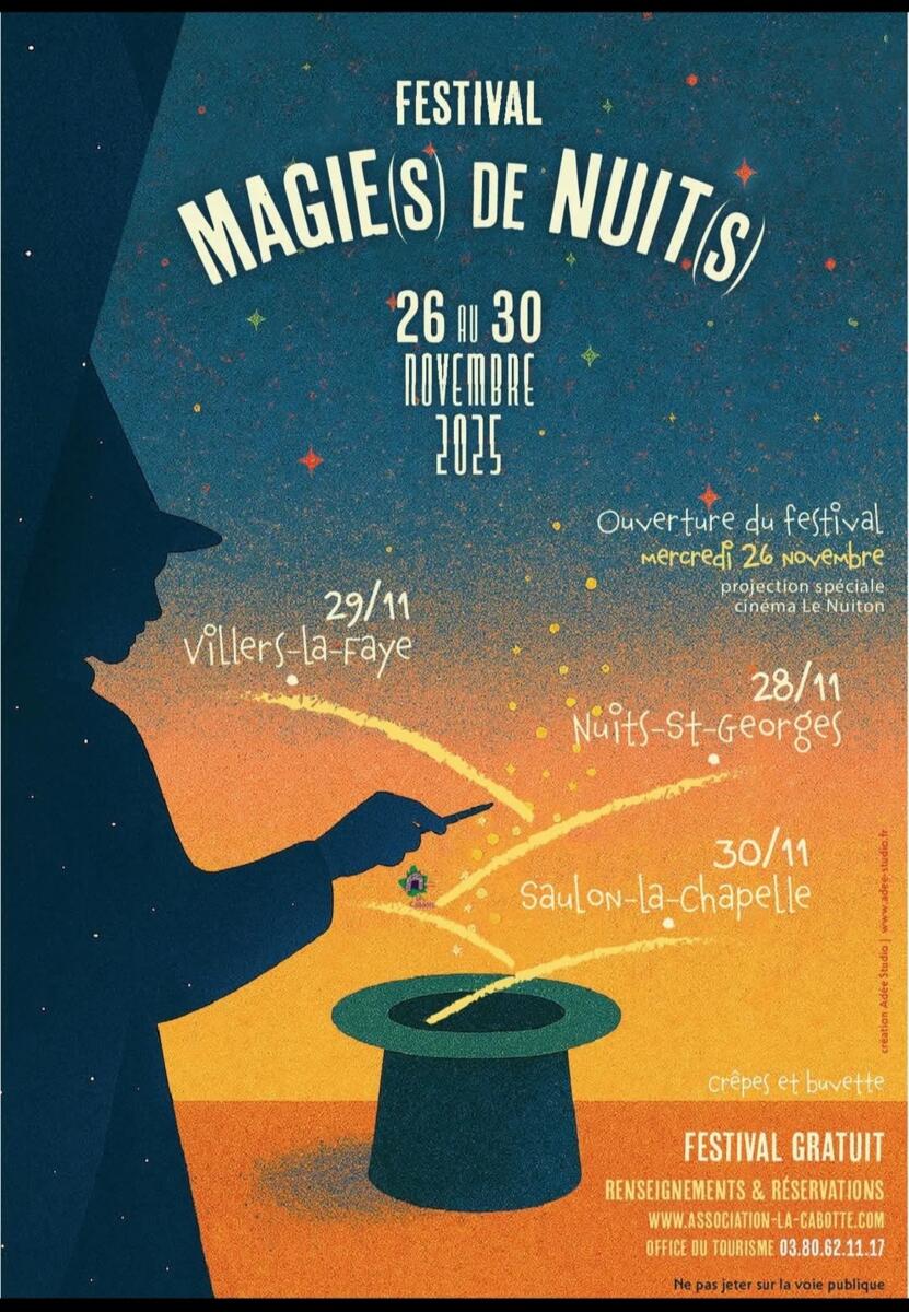Festival De Magie 22/11/2025 Dans le cadre de Magie(s) de Nuit(s), après-midi magie dimanche 30 novembre, 16 h, à la salle des fêtes. Entrée gratuite ; tickets d’entrée à prendre soit aux offices de tourisme de Gevrey/Nuits, soit à la mairie de Saulon.