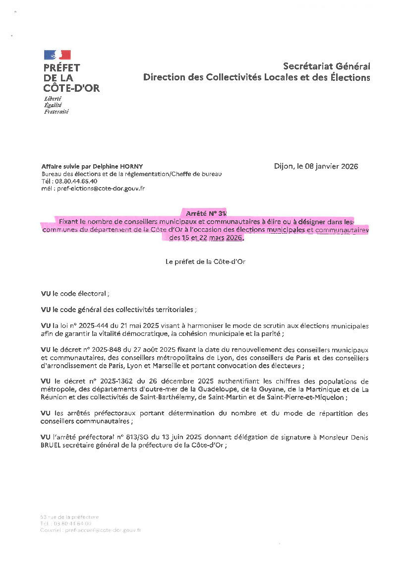 Ci-joint l'arrêté fixant le nombre de conseillers municipaux et communautaires à élire ou à désigner dans les communes du département de la Côte d'Or